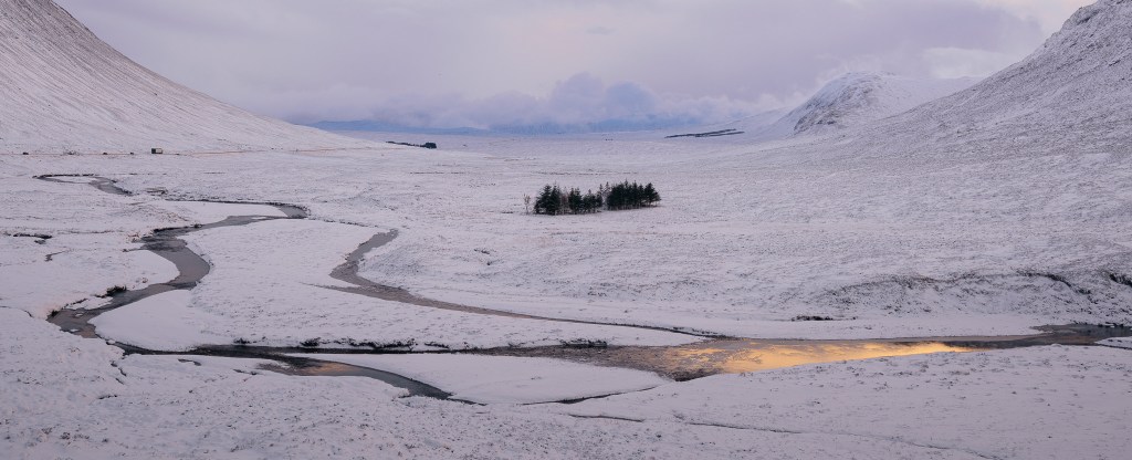 Our first blast of proper snow for the winter saw me heading off to Rannoch Moor. Roads were snowy but new winter tyres made everything a doddle although I was a little late arriving. Like many mornings, the light at Rannoch Moor rises to a peak just after dawn and then things go downhill as the weather rolls in again. Another stop at Altnafeadh to check out the layby (to see if I could park without getting stuck) and a glimpse of light teased me into staying…
