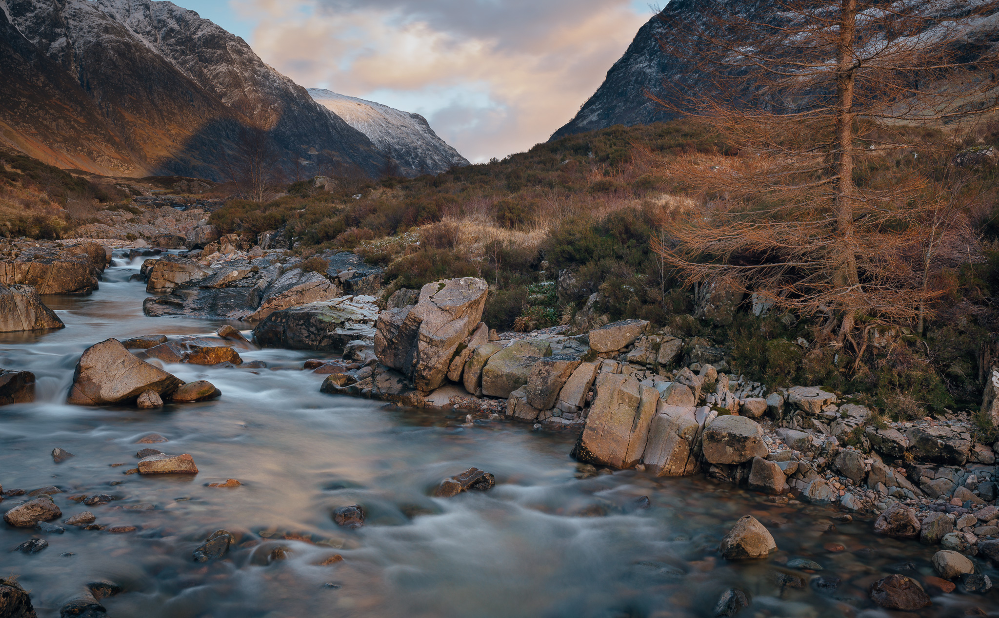 A walk down the Coe near the Clachaig to check out sunset light. Some nice ‘borrowed’ light from the top of the Aonach Eagach before sunset.