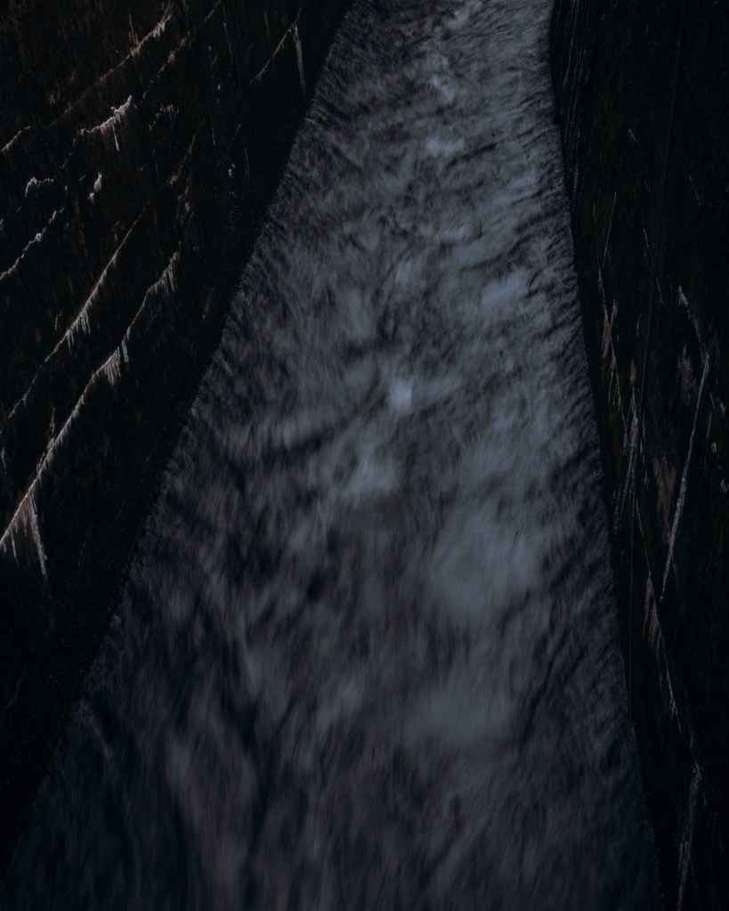 On a trip to the climbing wall in Kinlochleven, I took a wander around the car park and found the Blackwater reservoir outflow to be quite engaging. The black of the shadows and peaty tans of the water worked in this abstract photograph. Another below shows the channel through which the water runs before exiting the outflow and on into Loch Leven.